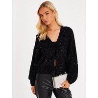 This oversized cardigan features a tie front detail and balloon sleeves, crafted from a warm knit material. Ideal for layering during cold weather, it offers a relaxed fit for comfort. | Quiz Women's Black Sequin Tie Front Cardigan Sweater | Size: Medium - Manufacturers part number: Quiz_5063331238325