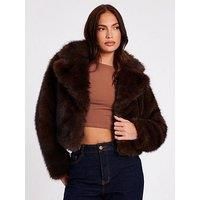This cropped jacket features a faux fur design with an oversized collar and long sleeves, providing warmth and comfort for winter outings or casual wear. Ideal for layering. | Quiz Women's Brown Faux Fur Cropped Jacket | Size: 12 - Manufacturers part number: Quiz_5063331245675