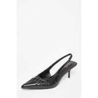 These court heels feature a ruched front design and a pointed toe, crafted from faux leather with a slingback ankle strap for secure wear. Ideal for evening outings. | Quiz Women's Black Faux Leather Ruched Court Heels | Size: 7 - Manufacturers part number: Quiz_5063331269930