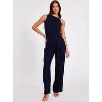 This sleeveless scuba crepe jumpsuit features a buckle detail and a wide leg design, making it suitable for various occasions such as weddings or formal events. | Quiz Women's Navy Buckle Detail Jumpsuit | Size: 14 - Manufacturers part number: Quiz_5063331292334
