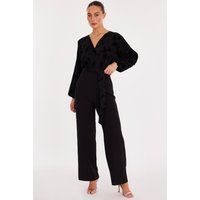 This jumpsuit features a wrap front design with long balloon sleeves and a tie waist for a flattering fit. Ideal for evening events, it offers comfort and style in one piece. | Quiz Women's Black Floral Bodice Jumpsuit | Size: 18 - Manufacturers part number: Quiz_5063331323595