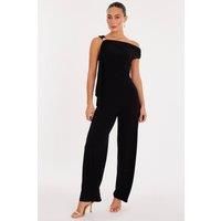 This off-the-shoulder jumpsuit features a sash detail and wide leg design, perfect for various occasions. Ideal for a sophisticated look, it offers comfort and style in one piece. | Quiz Women's Black One Shoulder Sash Detail Jumpsuit | Size: 14 - Manufacturers part number: Quiz_5063331356500