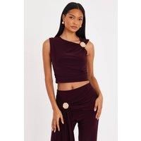 This cropped top features a unique asymmetric neckline and gold hardware accents. Ideal for night outings, it offers a stylish fit that enhances your silhouette while providing comfort. | Quiz Women's Plum Asymmetric Neckline Cropped Top | Size: 10 - Manufacturers part number: Quiz_5063331378830