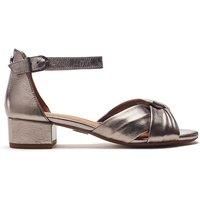 Meet Macadamia, the twist-front leather sandal. This style features a block heel, perfect for adding a little height to your outfit. The buckle fastening ensures a comfortable fit. | Moda In Pelle Women's 'Macadamia' Leather Heeled Sandals in Metallic Silver | Size: 3