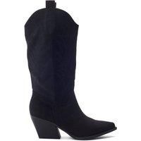 Ride high in Gwyndolyn the long Western. This style features a beautifully stitched pattern with a Cuban heel for added height. This style is perfect to pair with your everyday wardrobe. | b.soleful Women's 'Gwyndolyn' Alcantara Heeled Boots in Black | Size: 6