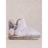 White Stuff Faux Fur Bootie Slipper Size & Fit True to size - order your usual size Standard fit Available in sizes S-L Details Faux Fur Bootie Slipper by White Stuff Grey Faux fur fabric Fair isle printed midsole Bobble tie detail Round toe Pull tabs Material & Care Material Content: Upper: 100% Polyester; Lining:100% Polyester; Outsole: 65% Textile/35% Tpr