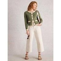 White Stuff Charlotte Cardi Size & Fit True to size - order your usual size Regular fit Available in sizes 8 - 18 Details Charlotte Cardi by White Stuff Green Knitted cotton fabric Long sleeves Crew neckline Button through fastening Contrast tipping Cute fake pockets Machine washable Material & Care Material Content: 100% Organic Cotton Washing Instructions: Machine Washable