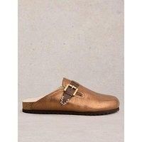 White Stuff Myrtle Slip On Footbed Size & Fit Standard fit Available in sizes 3 - 8 Details Myrtle Slip On Footbed by White Stuff Coloured Metallic Easy slip-on Nordic style Leather adjustable strap at top Hand-stitching and buckle detail Cosy inner lining Flat sole Do not wash Material & Care Material Content: Upper - Leather, Lining - Leather & Textile, Sole - EVA
