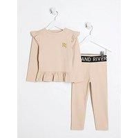 River Island Mini Girls Ribbed Waistband Top And Legging Set Size & Fit Available in sizes 12-18 months - 4-5 years Details Girls Ribbed Waistband Top And Legging Set by River Island Mini Beige Crew neck Long sleeves Frill shoulder and hemline Branded & elasticated waistband Material & Care Material Content: Cotton: 100% Washing Instructions: Machine Washable Set of 2 Ribbed fabric Top Crew neck Frill detail Embroidery RI branding Long sleeves Bottoms Elasticated RI waist