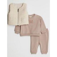 River Island Baby Boys 3 Pack Padded Gilet Set Size & Fit Available in sizes 0-3 months - 12-18 months Details Boys 3 Pack Padded Gilet Set by River Island Baby Brown Set of 3 Gilet Crew neck Embroidered RI graphic Zipped fastening Side slip pockets Sleeveless Sweatshirt Crew neck Long sleeves Bottoms Elasticated drawstring waist Material & Care Material Content: Cotton: 100% Washing Instructions: Machine Washable