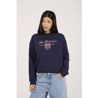 Stay casual yet stylish with this crew neck sweatshirt from Brave Soul. Made from a soft cotton-blend fabric, it features long sleeves and relaxed drop shoulders for effortless comfort. Finished with a classic crew neck, chest embroidery, and ribbed neck, cuffs, and hem, this versatile sweatshirt is perfect for everyday layering, offering a cosy and polished off-duty look. Model wears UK size S. | Brave Soul Women's Crew Neck Embroidered Sweatshirt in Navy | Size: Large - Manufacturers part number: Brave Soul_5063487074501