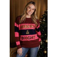 Add a touch of sparkle to your seasonal style with this jumper from Brave Soul. Featuring long sleeves and a classic crew neck, this cosy knit is designed with bold all-over stripes and a festive sequin slogan to the front. Finished with ribbed trims at the neck, hem, and cuffs, its the perfect jumper for Christmas parties and celebrations. Model wears UK size S. | Brave Soul Women's Sequin Slogan Christmas Jumper in Wine | Size: Small - Manufacturers part number: Brave Soul_5063487262700