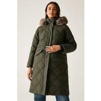 The Freyla women's insulated jacket from Regatta offers a stylish edge to everyday practicality. Made from durable micro poplin with Thermoguard insulation, it provides reliable warmth. The removable faux fur trim and adjustable waist create a refined silhouette, while lower pockets with snap fastenings ensure functional storage for day-to-day wear. | Regatta Women's Freyla Hooded Water-Repellent Insulating Baffled Jacket in Green | Size: 20