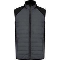 Material: 90% Polyester, 10% Elastane. Fabric: Ripstop. Design: Contrast Panel, Quilted. Fabric Technology: Showerproof. Elasticated Arm Holes. Sleeve-Type: Sleeveless. Neckline: Standing Collar. Pockets: 2 Front Pockets, Zip. Fastening: Full Zip. Hem: Elasticated. Sustainability: Amfori, BSCI, Oeko-Tex Standard 100 Certified. | Proact Men's Dual Fabric Padded Sports Body Warmer in Dark Grey | Size: XS - Manufacturers part number: Proact_UTPC7379_sportygreyblack_MP-7813