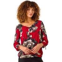 V-Neck Floral Print Tie Sleeve Top from Roman. Embrace a touch of floral charm with this lovely tie sleeve top. Adorned with an all over floral print, this top features a flattering V-Neck and a chic band at the hem for added style. The 3/4 sleeves are beautifully detailed with charming ties adding a playful touch. Crafted from flexible ITY stretch fabric, this top is not only comfortable but also stylish. Pair it with your favourite jeans and ankle boots for a fabulous Autumn/Winter look! | Roman Women's V-Neck Floral Print Tie Sleeve Top in Burgundy | Size: 12 - Manufacturers part number: Roman_5063566007727