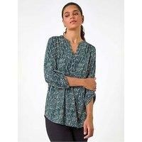 Abstract Print V-Neck Stretch Shirt Top from Roman. Build your basic wardrobe with some on-trend prints this season with this abstract print shirt. Cut from a comfortable stretch jersey fabric, this top features a flattering notch neckline with button fastenings and 3/4 length sleeves with adjustable tabs. Adorned in a unique abstract print this piece is designed to pull on overhead for quick and easy dressing. Pair with tailored trousers for work or add jeans and boots for a more casual look! | Roman Women's Abstract Print V-Neck Stretch Shirt Top in Khaki | Size: 18