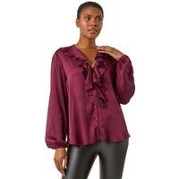 Ruffle Front V-Neck Satin Blouse from Roman. Let your outfit do the talking with our elegant v-neck satin blouse. Adorned with a charming ruffle front and button detail, this blouse boasts a full opening with a feminine v-neckline. Featuring cosy long sleeves finished with elasticated cuffs while staying stylish in a flattering hip-length blouse shape. Perfect for parties or laidback events, this comfortable woven blouse pairs beautifully with wide-leg trousers and heeled boots for a glam look! | Roman Women's Ruffle Front V-Neck Satin Blouse in Wine | Size: 10 - Manufacturers part number: Roman_5063566014664