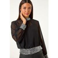 High Neck Chiffon Sequin Stretch Top from Roman. Shine bright in our glamourous sequin detail top, perfect for the Autumn Winter. Crafted from delicate chiffon fabric, this top features intricate sequin detailing on the high neckline, and long cuff sleeves to add an elegant touch. Pair with tights and a skirt for a classy look that will turn heads wherever you go! | Roman Women's High Neck Chiffon Sequin Stretch Top in Silver | Size: 20 - Manufacturers part number: Roman_5063566019171