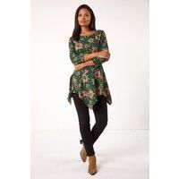 Floral Print Hanky Hem Stretch Top from Roman. Flaunt your feminine style in this floral print hanky hem tunic top this Autumn Winter. Crafted from a comfy stretch jersey fabric, this top features a flattering round neckline and elegant 3/4 length sleeves. The blooming floral print adds a touch of charm, while the hanky hem detail creates a flowing silhouette. Style it with your favourite winter boots and a cosy coat for a trendy look | Roman Women's Floral Print Hanky Hem Stretch Top in Green | Size: 14