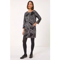 Abstract Print Pocket Detail Tunic Dress from Roman. Ready to create the perfect Autumn/Winter ensemble with this abstract print tunic dress! This shift dress features a unique abstract print and convenient functional pockets for a stylish twist. The 3/4 sleeves add a touch of elegance, while the knee length cut offers versatility for both day and evening wear. Complete the look with tights and heeled boots for a chic and trendy outfit this season!