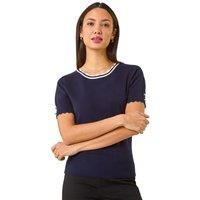 Scallop Edge Knit T-Shirt from Roman. Add a touch of elegance to your casual wardrobe with this sophisticated scallop edge knit T-shirt. Crafted from a lightweight fabric, this short sleeve tee features a stylish crew neckline adorned with a scallop edge. Diamante button detail at the cuff adds a touch of glamour to this versatile top. Pair with your favourite jeans and ankle boots for an effortlessly chic Autumn/Winter look! | Roman Women's Scallop Edge Knit T-Shirt in Navy | Size: 18 - Manufacturers part number: Roman_5063566072183