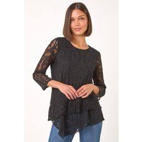 Burnout Print Asymmetric Stretch Top from Roman. Add a touch of contemporary style to your Autumn Winter wardrobe with this trendy asymmetric top. The flattering round neckline and long sleeves make it perfect for keeping you warm. Crafted from a comfortable woven fabric, this top features a unique abstract burnout print and a double asymmetric hem for added interest. Pair with wide-leg trousers and ankle boots for a sophisticated look! | Roman Women's Burnout Print Asymmetric Stretch Top in Black | Size: 10 - Manufacturers part number: Roman_5063566111004