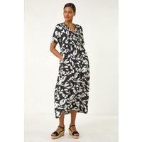 Abstract Print Tie Front Midi Dress from Roman. Stand out this Spring/Summer in this chic abstract printed midi dress. Featuring a smart collar and short sleeves, the dress has a full button-through front and a versatile midi length. The tiered skirt adds movement, creating a flattering silhouette that is perfect for any occasion. Style with sandals for a casual daytime look, or add a denim jacket for added flair and layering options. | Roman Women's Abstract Print Tie Front Midi Dress in Black | Size: 12 - Manufacturers part number: Roman_5063566124158