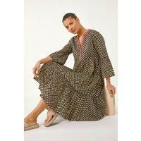 Geometric Tiered Midi Dress from Roman. This geometric tiered dress features a flattering V-neckline and long sleeves, offering both style and coverage. The midi length and smock shape provide a relaxed and comfortable fit, while the geometric pattern adds a modern, bold touch. Pair it with sandals and a denim jacket for a chic, easygoing look that's perfect for casual outings or warm weather days! | Roman Women's Geometric Tiered Midi Dress in Black | Size: 16 - Manufacturers part numbers: Roman_5063566169661|144955p