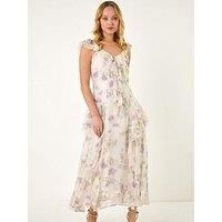 Dusk Floral Print Ruffle Maxi Dress from Roman. Make a stunning entrance this Spring Summer season in this floral print maxi dress. Embrace your feminine side with the v-neckline and flutter sleeves adorned with delicate ruffle detailing. The blooming floral print adds a touch of romance, while the comfortable woven chiffon fabric ensures a flattering flowy silhouette at maxi length. Complete the look with a bolero and heels for any special occasion!