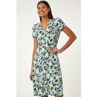 Floral Print Button Through Stretch Dress from Roman. Feel fabulous in this blooming floral dress, perfect for Spring Summer events. Crafted from a comfortable stretch jersey fabric, this dress features a feminine v-neckline and short sleeves for an airy silhouette. Featuring front button details while the flattering knee length cut ensures a stylish finish. Style with a denim jacket and wedged heels for the ultimate Spring Summer outfit. | Roman Women's Floral Print Button Through Stretch Dress in Light Blue | Size: 18 - Manufacturers part number: Roman_5063566186293