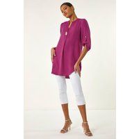 Button Detail V-Neck Longline Tunic Blouse from Roman. Add elegance to your every day style with this longline blouse. Cut from a smooth woven fabric this top features a feminine notch neckline, finished with a striking feature button and 3/4 length sleeves with adjustable tabs. Designed in a longline length, this piece is perfect when paired with tailored trousers for work or leather trousers for an evening with friends! | Roman Women's Button Detail V-Neck Longline Tunic Blouse in Magenta | Size: 12 - Manufacturers part numbers: Roman_5063566235724|200362p