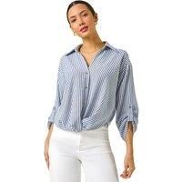 Roman Twisted Hem Striped Shirt - Blue Elevate your Summer wardrobe with this chic stripe twist hem shirt. Embracing an all over stripe pattern this shirt features a stylish v-neck with a smart collar and 3/4 sleeves with tabs for a versatile look. The button opening at the front adds a classic touch while the twist hem detail adds a modern touch to this timeless design. Pair with linen wide leg trousers and sandals for a sophisticated and breezy outfit. Material Content: 100% Polyester Washing Instruct... - Manufacturers part number: Roman_5063566253698