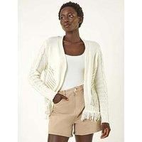 Lightweight Fringe Hem Knit Cardigan from Roman. Effortlessly stylish, this lightweight knitted cardigan is the perfect layering piece for the warmer days. Featuring an edge to edge design and long sleeves, this versatile cardigan adds a touch of chic to any outfit. Ideal for Spring/Summer, it can be easily paired with a cami top and jeans for a casual yet trendy look. - Manufacturers part number: Roman_5063566258235