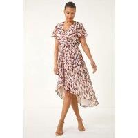 Leopard Ruffle Front Dress from Roman. Unleash your wild side with this fabulous leopard print dress. Featuring a flattering wrap bodice and charming ruffle front detail, this dress is perfect for the Spring/Summer season. Short sleeves and a midi length complete the look, making it ideal for both day and night events. Pair with strappy heels and a chic blazer for a sophisticated ensemble that will make a statement wherever you go! - Manufacturers part numbers: 141131p|Roman_5063566265202