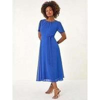 Pleat Chiffon Belted Midi Dress from Roman. Make a stylish statement this Spring/Summer season with this flattering yet elegant chiffon dress. The pleated neck detail adds a touch of sophistication while the short sleeves keep it fresh and light. The fit and flare style, cinched at the waist with a tie belt, showcases your silhouette beautifully. Crafted from light chiffon, this dress is perfect for any special occasion. Complete the look with strappy heels and a smart blazer for an effortlessly chic ensemble. | Roman Women's Pleat Chiffon Belted Midi Dress in Blue | Size: 16 - Manufacturers part number: WP6LB