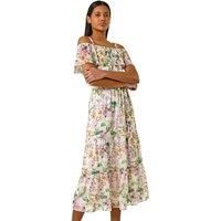 Floral Print Bardot Midi Dress from Roman. Flaunt your feminine charm in this stunning floral bardot dress. Crafted from delicate chiffon fabric, this midi length dress features an elegant off-shoulder neckline, perfect for showcasing sun-kissed shoulders. The beautiful floral print adds a touch of romance to the look. Pair it with strappy heels and a chic blazer for a sophisticated and stylish ensemble. | Roman Women's Floral Print Bardot Midi Dress in Cream | Size: 20 - Manufacturers part number: Roman_5063566277878