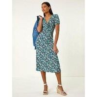 Roman Floral Front Twist Stretch Midi Dress - Navy Look effortlessly chic in this V-neck floral midi dress. The charming green floral print enhances the beauty of this dress complete with a stylish twist front detail. Designed with short sleeves this dress is perfect for the Spring/Summer season. Pair with sandals and a denim jacket for a relaxed and stylish look that will take you from day to night! Material Content: 96% Viscose 4% Elastane Washing Instructions: Machine Washable Length: Approx. 120cm - Manufacturers part number: 140876p