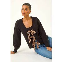 Animal Tie Front Knit Cardigan from Roman. Wrap up in style with this adorable animal tie knit. This classic v-neck cardigan is perfect for colder days, keeping you warm and stylish with long sleeves. Crafted from a soft knitted fabric for ultimate comfort, this cosy cardigan is finished with a trendy animal print tie front detail. Layer it over your favourite blouse and jeggings, paired with ankle boots for a complete Autumn outfit! | Roman Women's Animal Tie Front Knit Cardigan Sweater in Black | Size: 16 - Manufacturers part number: Roman_5063566336995