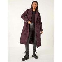 Dusk Chevron Wrap Quilted Puffer Coat from Roman. Wrap up in style this Autumn Winter with this chevron wrap puffer coat. This cosy coat features a stylish wrap over collar and revere front, perfect for keeping you warm throughout the colder months. Crafted from a comfortable chevron fabric with quilted detail, this coat is as trendy as it is practical. Complete with long sleeves and welt pockets for essentials, it is finished with a belt fastening. Layer over your favourite blouse and jeggings with ankle boots for the perfect fall season look! | Dusk Women's Chevron Wrap Quilted Puffer Coat in Wine | Size: 12 - Manufacturers part number: 120425p