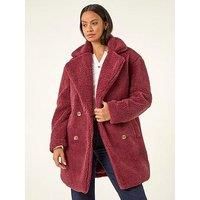 Roman Dusk Oversized Boucle Coat - Burgundy Wrap up in style with this oversized boucle coat in a chic burgundy colourway. This statement coat features a cosy boucle texture with a modern and roomy fit perfect for layering over your favourite knitwear and jeans. Finished with two practical side seam pockets and a classic center front button fastening this coat is the ideal outerwear piece for the Autumn/Winter season. Material Content: 100% Polyester Lining: 51% Polyester 49% Viscose Washing Instruction...