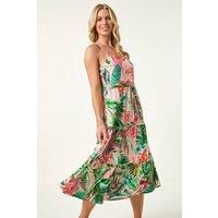 Petite Tropical Strappy Tiered Dress from Roman. This effortlessly stylish midi dress features a flattering square neckline and a strappy design for a chic, feminine touch. The fit-and-flare silhouette, combined with a tiered skirt, creates beautiful movement and elegance. Crafted from a comfortable stretch fabric with an easy pull-on style, its perfect for all-day wear. Pair with sandals and a denim jacket for a relaxed yet fashionable look. | Roman Women's Petite Tropical Strappy Tiered Dress in Pink | Size: 18 - Manufacturers part number: Roman_5063566353701