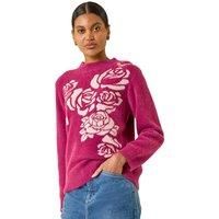Contrast Rose Knit Jumper from Roman. Wrap yourself in style with this rose design knit for the upcoming Autumn/Winter season. Adorned with a beautiful rose pattern in contrasting colours, this soft-knit jumper features a classic crew neck and cosy long sleeves. The intricate design and soft hand feel make this piece a must-have for the colder days ahead. Pair with your favourite jeans and ankle boots for a chic and comfortable look that exudes elegance! | Roman Women's Contrast Rose Knit Jumper in Pink | Size: 18 - Manufacturers part number: Roman_5063566359505