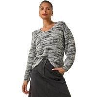 Shimmer V-Neck Knitted Jumper from Roman. Add a touch of glamour to your Autumn Winter wardrobe with this shimmer v-neck knitted jumper. The flattering v-neckline and long sleeves ensure you stay warm, while the soft shimmer knit fabric adds a hint of sparkle to your outfit. Designed in a classic jumper shape, this piece is versatile and easy to style. Pair with a denim jacket and boots for a complete fall look that takes you from day to night effortlessly! | Roman Women's Shimmer V-Neck Knitted Jumper in Black | Size: 20 - Manufacturers part number: Roman_5063566373709
