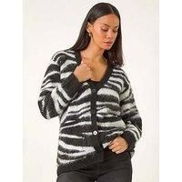 Roman Dusk Zebra Print Fluffy Knit Cardigan - Black Make a wild statement with this zebra print cardigan perfect for the Autumn/Winter season. Featuring a stylish V-neckline and practical front pockets this long-sleeve cardigan is both fashionable and functional. The button detailing adds a touch of sophistication to this eye-catching piece. Style it casually with a simple t-shirt and jeans for a chic everyday look! Material Content: 49% Polyester 21% Acrylic 21% Polyamide 7% Wool 2% Elastane Washing In... - Manufacturers part number: 161628p