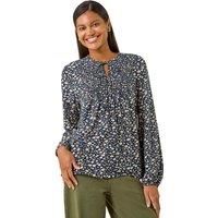 Printed Shirred Tie Neck Top from Roman. Get ready to make a chic statement this Autumn/Winter season in this shirred tie neck top. Featuring an all over print with a stylish tie neck detail that finishes at the hips, this top is designed with a classic round neckline and elegant long sleeves. Perfect for pairing with jeggings and ankle boots for a fashionable look that's both stylish and comfortable. | Roman Women's Printed Shirred Tie Neck Top in Navy | Size: 18 - Manufacturers part numbers: Roman_5063566397729|194252p