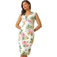Rose Print Lace Knot Stretch Dress from Roman. Make a statement with this stunning rose print knot dress. Featuring a classic v-neckline and sleeveless style, this dress is crafted from a comfortable stretch fabric adorned with a delicate lace rose print. The twist front knot detail adds a feminine touch, creating a flattering fit. Perfect for Spring Summer, style with heels and a light bolero for your next special occasion! - Manufacturers part number: Roman_5063566410725