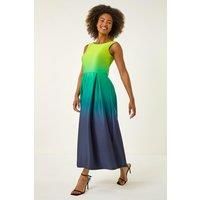 Ombre Pocket Stretch Midi Dress from Roman. Elevate your Spring Summer wardrobe with this vibrant ombre stretch dress. Featuring a trendy round neckline and a stunning ombre print, this bold dress is crafted from a comfortable stretch fabric. The pleated details add a touch of elegance to this midi dress. Pair with strapped heels and a bolero for a polished and stylish look!