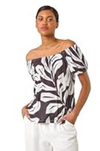 Get this Roman Originals Bardot Top Off Shoulder Blouse for Women UK - Ladies Floral Print Shirt Palm Leaf Tropical Ditsy Cold Shoulder Jersey Frill Cuff Summer Spring Holiday - Noir Abstract - Size 18 from Amazon for only £24.00. We found this offer today, so hurry whilst stocks last! - Manufacturers part number: 190799p