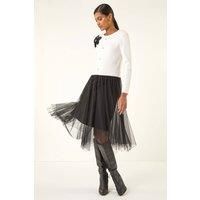 Buttoned Knit Mesh Midi Dress from Roman. Achieve effortless elegance in this unique 2 in 1 button detail midi dress. Featuring a delicate floral motif on the bodice, this dress is a stylish statement piece. With a classic round neckline and short sleeves, the knitted top transitions seamlessly to a chic mesh skirt, adding a touch of texture and flair. Pair with tights and ankle boots for a sophisticated Autumn/Winter look that's sure to turn heads! | Roman Women's Buttoned Knit Mesh Midi Dress in Ivory | Size: 14 - Manufacturers part number: Roman_5063566421530