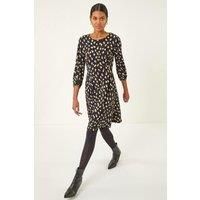 Speckled Print Stretch Dress from Roman. Get ready to make a statement in this speckled print dress, your go-to piece this season. This dress features a classic round neckline and 3/4 sleeves, with a stylish speckled spot print. Cut from stretch jersey fabric, it is designed to finish at knee length with a flattering empire waistline. Complete your Autumn Winter wardrobe by styling it with a denim jacket and ankle boots for a stunning fall look! | Roman Women's Speckled Print Stretch Dress in Beige | Size: 20 - Manufacturers part numbers: Roman_5063566426665|141161p